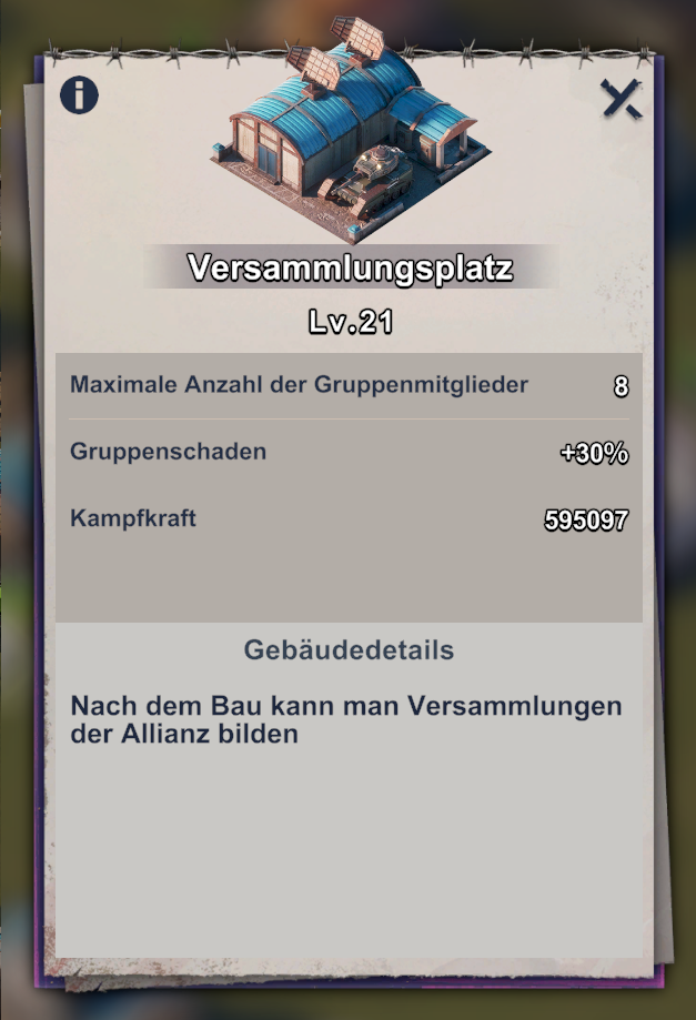 Zum Beispiel erlaubt ein Level 20 Versammlungsplatz Gruppenangriffe mit 8 Teilnehmern und gibt einen Schadensbonus von +30%.