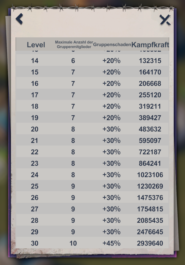 Mit Level 30 sind dann Gruppenangriffe mit 10 Teilnehmern und +45% Schaden möglich.