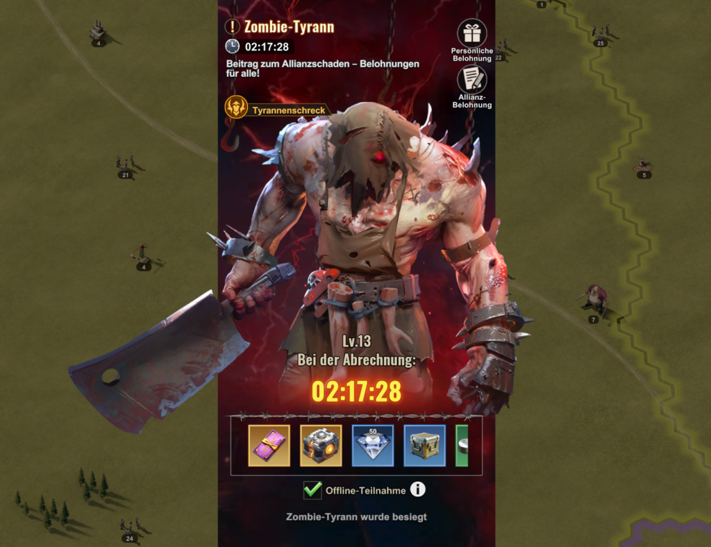 - Während das Zomie-Tyrann-Event zugange ist, sollten keine Gruppenangriffe auf Riesenzombie, kein Abbau von Ressourcen oder Aktivitäten (z.B. Helikopter-Erkundung) gestartet werden, die Truppen vom Tyrannen abziehen.